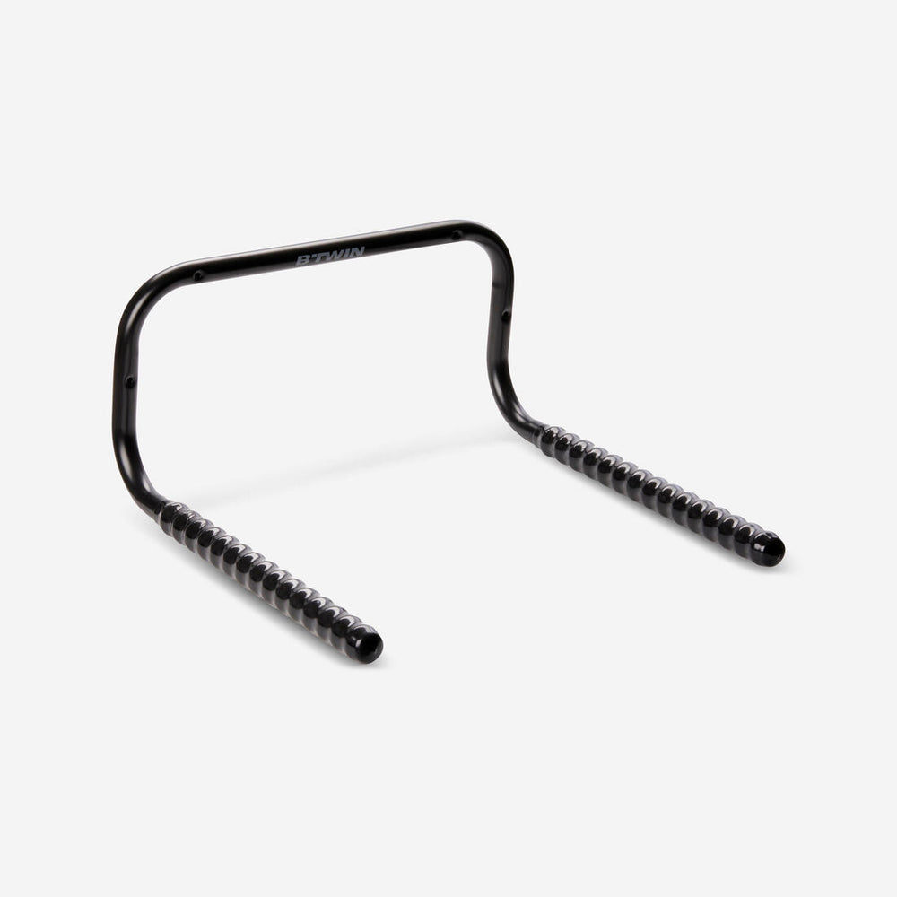 This bike mount has 4 pre-drilled holes so you can easily attach it to your wall. We recommend not attaching the bike mount too high up the wall to ensure that you allow enough space for the upper section of your bike (seat post and saddle) and prevent you from lifting your bike higher than necessary. Also remember to allow enough space around the sides and underneath for your wheels!