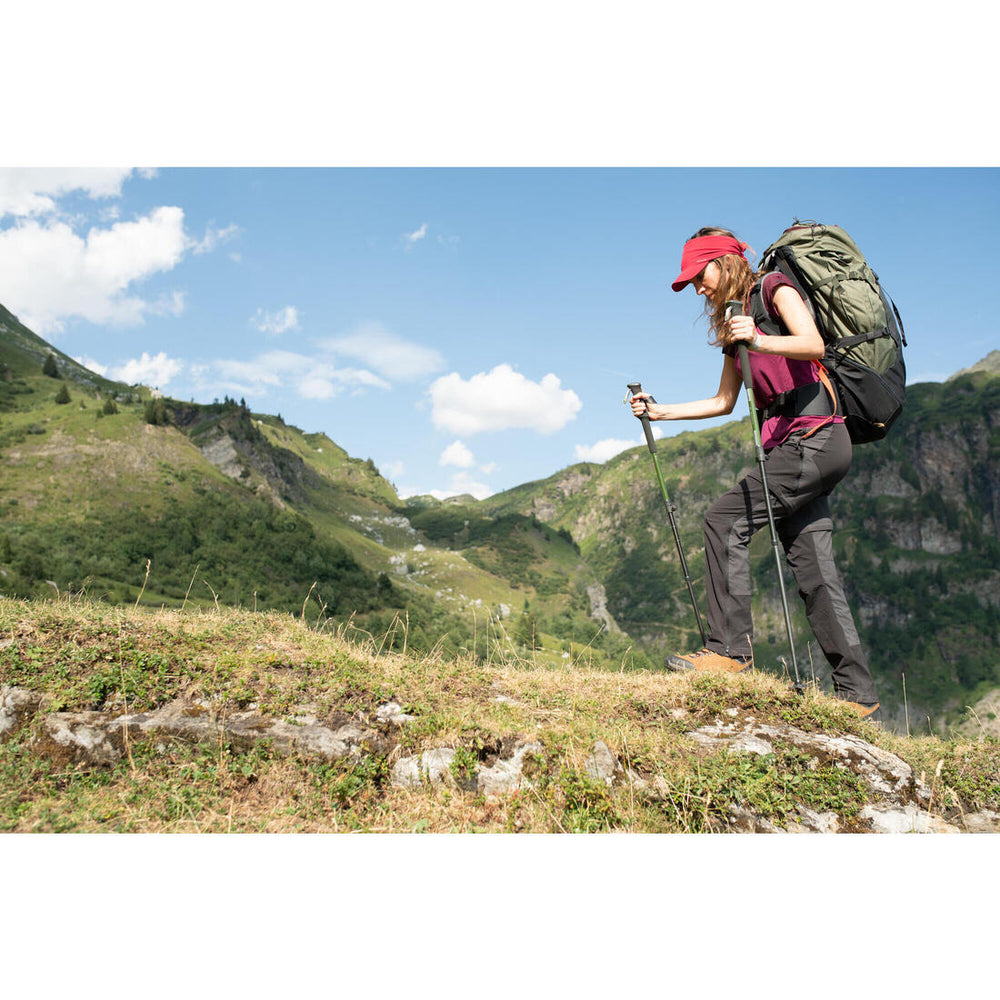 This hiking pole is designed to help you balance, propel yourself and distribute effort between arms and legs. To be on the safe side, check before you set off and at regular intervals that your baton is locked in place by simulating heavy bumps. If you notice that your pole tends to slide down, the locking mechanism turn ring needs adjusting. Open the lever and turn the knob a quarter to a half turn. Do not put on your backpack in case of a storm.