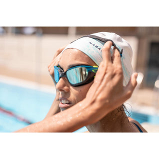 Did you know? There’s a right and a wrong way round to wear a swim cap! Mesh caps have a central band designed to run from front to back. For silicone swimming caps, the fold line (visible when the cap is laid flat) is made to go in the same direction as the others. Place both hands together inside the cap. Spread your hands (and fingers) to create space, then put the cap on. At the front, it should sit about a finger’s width above your eyebrows.