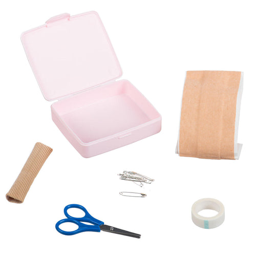 Bandages, adhesives, and scissors are used to treat your feet and especially your toes which are subject to the irritation and rubbing of demi-pointe and pointe shoes. It also includes pins so that you can take up your leotard or attach rubber bands or ribbons to your shoes.