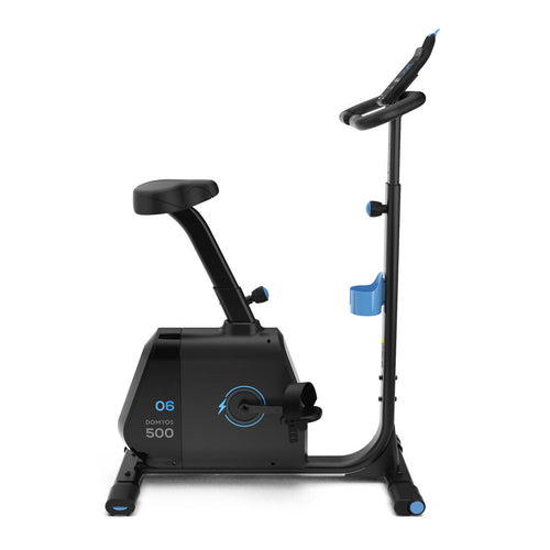 The Domyos EB 500 exercise bike\'s console features: - 6 functions: calories burned, distance covered, training time, speed, heart rate and RPM. - 7 programs developed in cooperation with our coaches to help you with your training.