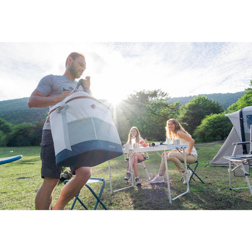 35 L. Recommended for 4 to 8 people. On the outside, you will find three stretch mesh storage pockets.Inside, you will find a mesh pocket for adding ice packs. Thanks to its separator, if you place it horizontally, you can keep the food on the lower level cool for longer. You can also place it vertically to organise your cooler.