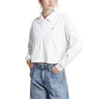 \"This adidas sweatshirt is made with a hint of velour for a soft, luxurious feel. It\'s topped off with an elegant, fold-down collar. The loose, crop shape pairs perfectly with your everyday uniform of high-waisted pants and sneakers. A gold adidas Badge of Sport adds the standout detail.\"