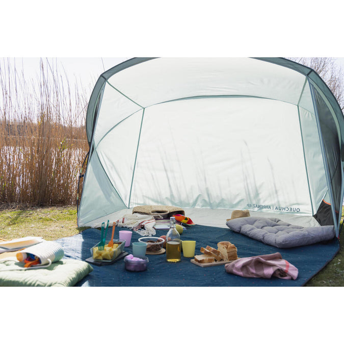 Perfect for sheltering up to 4 people, 2 adults and 2 kids. Whether seated or laid out, the groundsheet will protect you from the ground (moisture, dirt, roughness). See through the sides with the 2 ventilated fabric windows. Max shelter height: 1.15 m Shelter width: 1.7 m maximum width Shelter depth: 1.1 m (on the ground) Once unfolded, the shelter forms a 1.9 sqm rectangle on the ground.