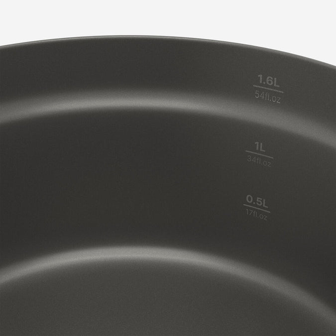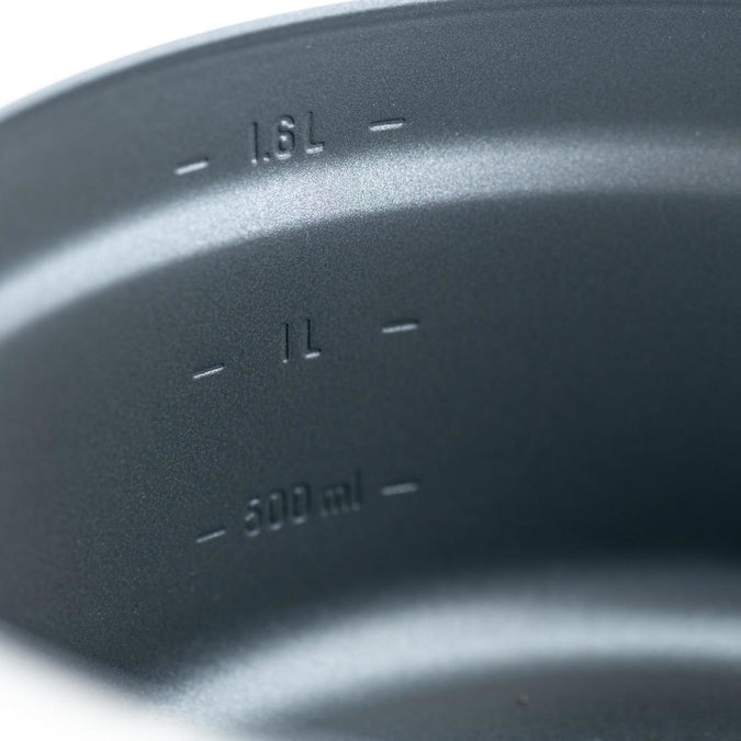 - Saucepan: 1.6 l usable, 437 g, Ø 18 cm x 9.5 cm - Frying pan: 0.5 l usable, 358 g, Ø 18 cm x 4.5 cm - Bowl: 0.4 l, 62 g per unit, Ø 17 cm - Mug: 0.2 l, 32 g per unit - Cutlery: 20 g per set - Lid / strainer: 89 g -Wooden place mat: 165 g - Carry case: 34 g