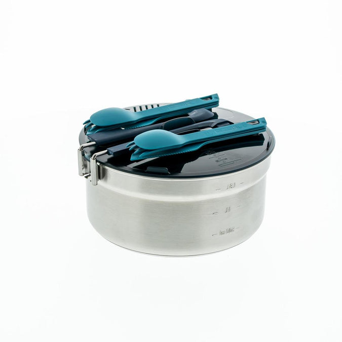 This cooking set also contains everything you need for 2 people to eat: - 2 bowls; - 2 mugs; - 2 sets of cutlery (fork, spoon, knife) that clip together.