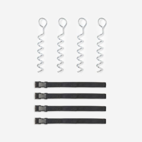 4 steel stakes and 4 straps that take just a few minutes to set up