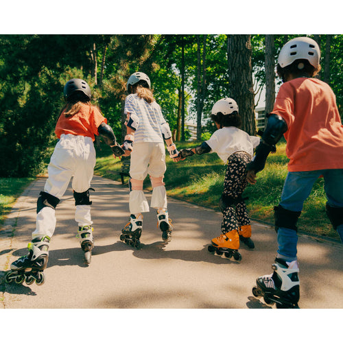 Unlike plastic, which skids but doesn\'t brake, rubber provides good traction. This stops your child from slipping when they push off, as well as helping them brake effectively. What\'s more, rubber also wears out less quickly than plastic. Our Oxelo teams work hard to keep your child safe, however experienced they are. So we\'ve chosen to equip all of our kids\' skates with wheels and brakes made out of rubber, not PVC.