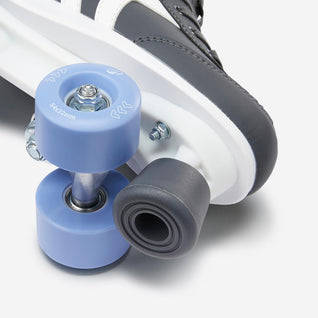 The terms \"roller skate\" and \"quad skate\" are used to designate the same thing. The Quad 100, also called fitness quad skates, are above all versatile roller skates designed for your child to wear while learning how to skate or practising occasionally. We put comfort first during the design process. That way, your child can concentrate on how much fun they\'re having. The vintage style of these wheeled shoes is a nod to roller skates from the 80s.