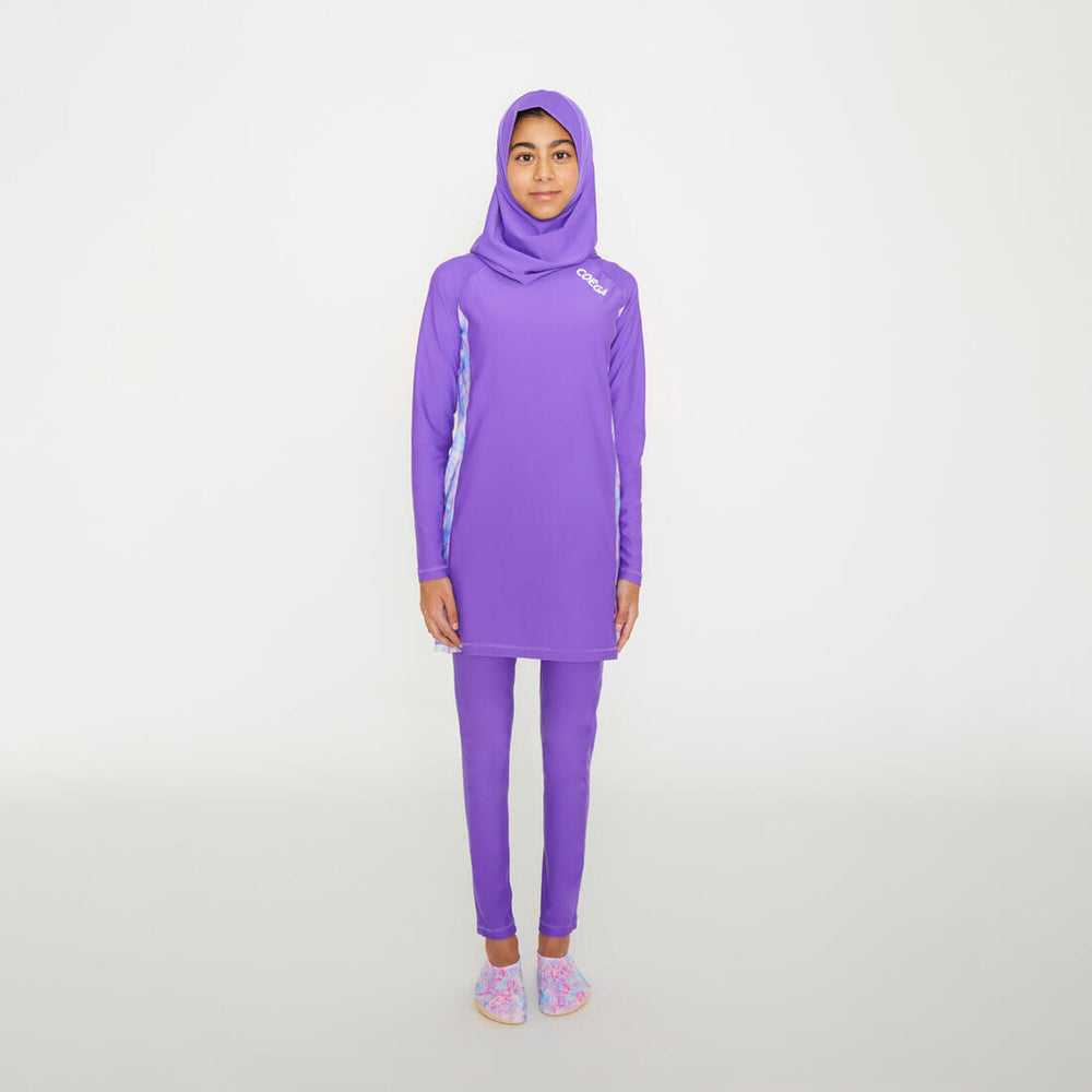 This unique and comfortable three-piece design is perfect whether looking for modesty or extra sun protection, while enjoying water sports at the beach or pool. Made with soft stretch fabric, the outfit includes a mid-length long sleeve Swim Tunic with matching full length Swim tights and a well-fitted Swim Shaela. Go Ahead, Love the Sun!
