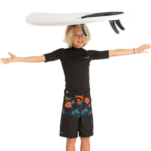 Kids' UV-resistant short-sleeved T-shirt for sun protection, even in the water, and to reduce irritation from skin coming into contact with the board. Close fit for greater stability in the waves.