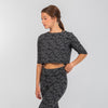 This short-sleeved crop top is made from technical fabric that holds it in place during use. The stylish print gives you a totally modern look for your classes and shows. This dance crop top has a fashionable shape while still looking perfectly at home in the world of modern jazz and contemporary dance.
