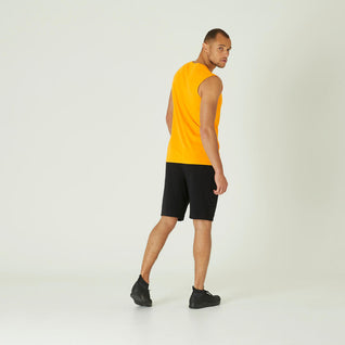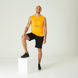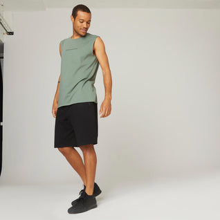 A photo of the Men's Crew Neck Straight-Cut Cotton Fitness Tank Top 500 - Green With Pattern in use