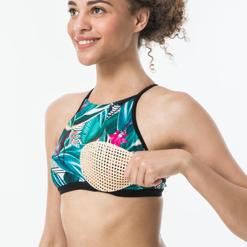 Shaped cups built in to the swimsuit top are flattering for your bust and sculpt your breasts into a rounded shape without having visible seams and avoiding irritation as opposed to cut and stitched foam pads. Olaian has kept you and your comfort in mind by favouring the use of padded cups in most of its models. The padded cups may be removable and, if so, they let you go up or down a half size.