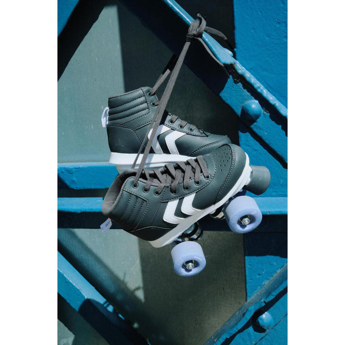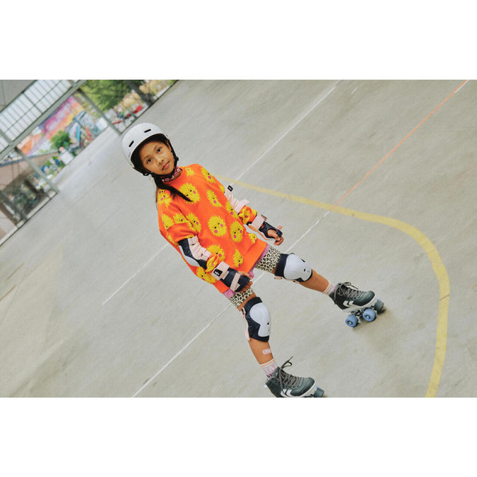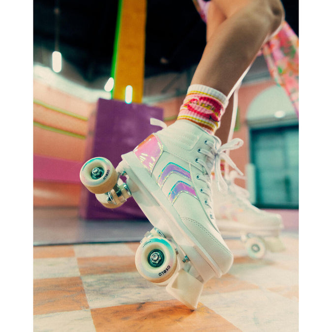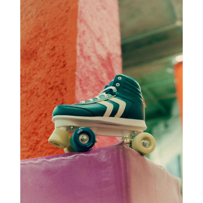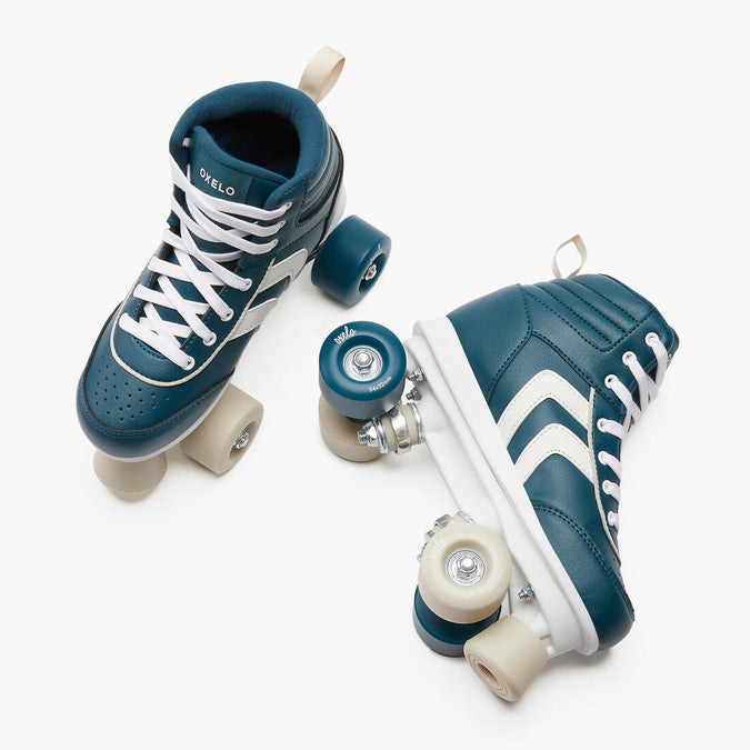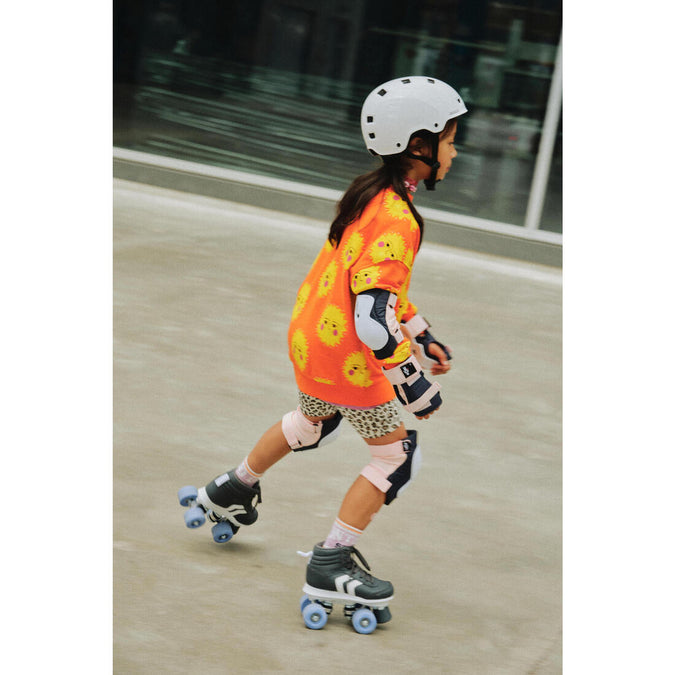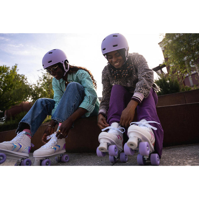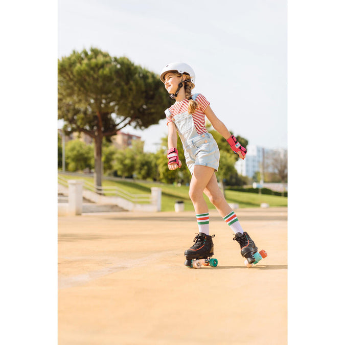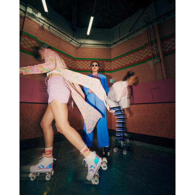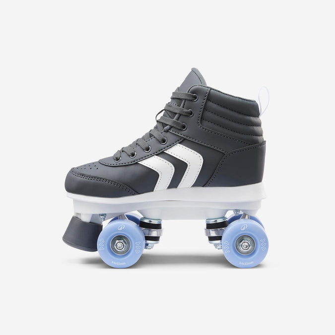 The terms \"roller skate\" and \"quad skate\" are used to designate the same thing. The Quad 100, also called fitness quad skates, are above all versatile roller skates designed for your child to wear while learning how to skate or practising occasionally. We put comfort first during the design process. That way, your child can concentrate on how much fun they\'re having. The vintage style of these wheeled shoes is a nod to roller skates from the 80s.