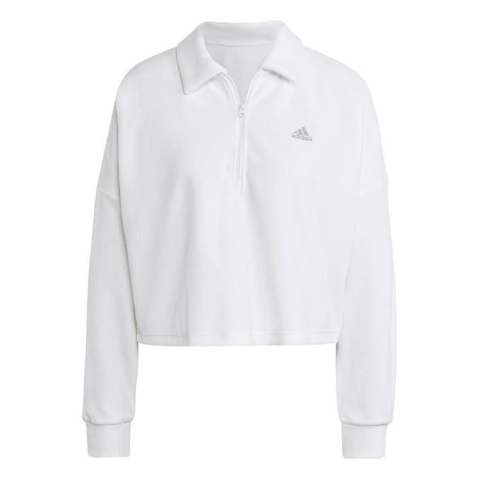 \"This adidas sweatshirt is made with a hint of velour for a soft, luxurious feel. It\'s topped off with an elegant, fold-down collar. The loose, crop shape pairs perfectly with your everyday uniform of high-waisted pants and sneakers. A gold adidas Badge of Sport adds the standout detail.\"
