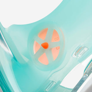 The fresh air is projected onto the glass before reaching the nose or mouth via the nasal valves. The constant supply of fresh air reduces the amount of fogging up in the mask. The air packed with moisture and CO² is evacuated through channels located inside the mask’s rim, which leads this air into the snorkel. The air is constantly renewed. The flow of air going in and out are separated to avoid mixing in polluted air and allowing you to breathe fresh air. Licensed under Ocean Reef Group