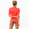Women’s UV-resistant short-sleeved T-shirt for protection from the sun, even in the water, and to limit irritation when in contact with the board. Close fit for greater stability in the waves.