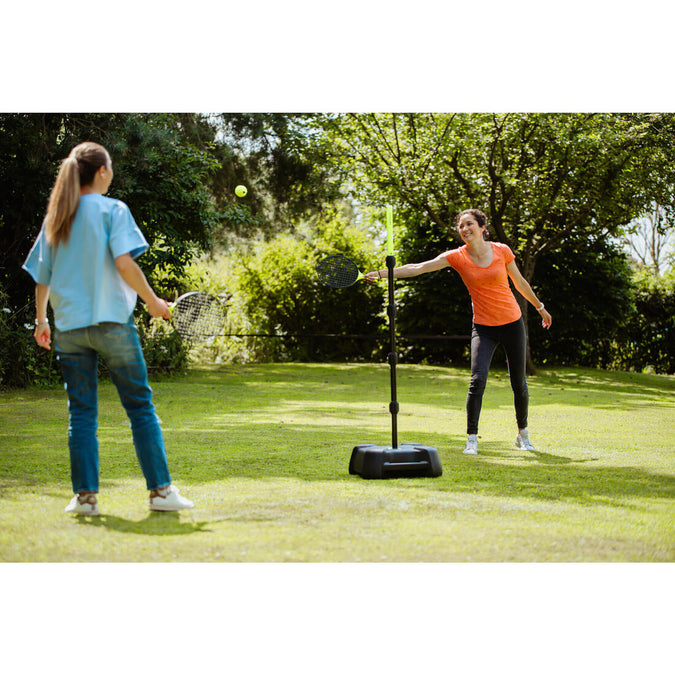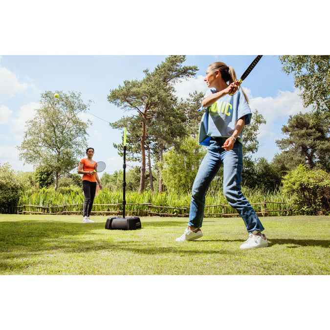 Well constructed and stable (once you've filled the base with water/sand) alternative to SwingBall. I say alternative as their are subtle differences. Speedball sets do not have a stop-point for the connection between the ball and the post, they simply spin around a central point. This allows for a simpler mechanism, and longer games - we play a version where if you miss or mis-hit the ball when you are meant to give it a whack, your opponent gets a point, then score until a set limit. The bats/rackets are perhaps a little too flexible when compared with a swingball bat, but this could be to reduce the likelihood of a strapping teenager/20 to 60-something from belting the ball too hard... Great fun and just about portable enough to take on camping trips or to BBQs at friend's houses etc.