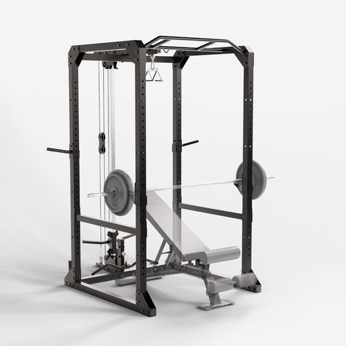 This cage is sold separately. To work on your Rack 900 weight training cage, we advise adding: - 1 x 2 m, 28 mm bar (ref: 8289900) or - 1 x 2 m, 50 mm bar (ref: 8491834) - Weights (28 mm ref: 1042303, 50 mm ref: 8484128 for 20 kg) To accessorise it, you can add: - A dip kit (ref: 8612857) - A landmine (ref: 8766095, 50 mm or 28 mm with included adapter) - The Bench 900 (ref: 8766093) - Floor slabs
