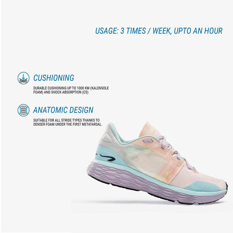 The cushioning in DECATHLON RUN COMFORT running shoes is provided by a sole made of exclusive, flexible and soft EVA (Ethylene vinyl acetate) foam that we have dubbed KALENSOLE, along with the \'Circular System\' technology: an air hole in the foam at the heel enables more effective and uniform dispersion of the shock wave.