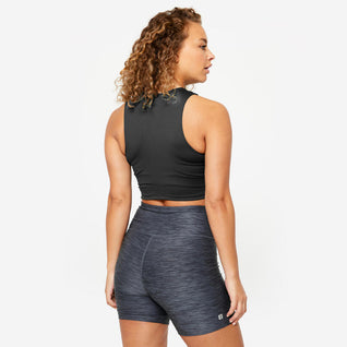 The tank top of the season! Its cropped cut is combined with the comfort of a breathable stretch fabric and a higher neckline. Wear over a sports bra!