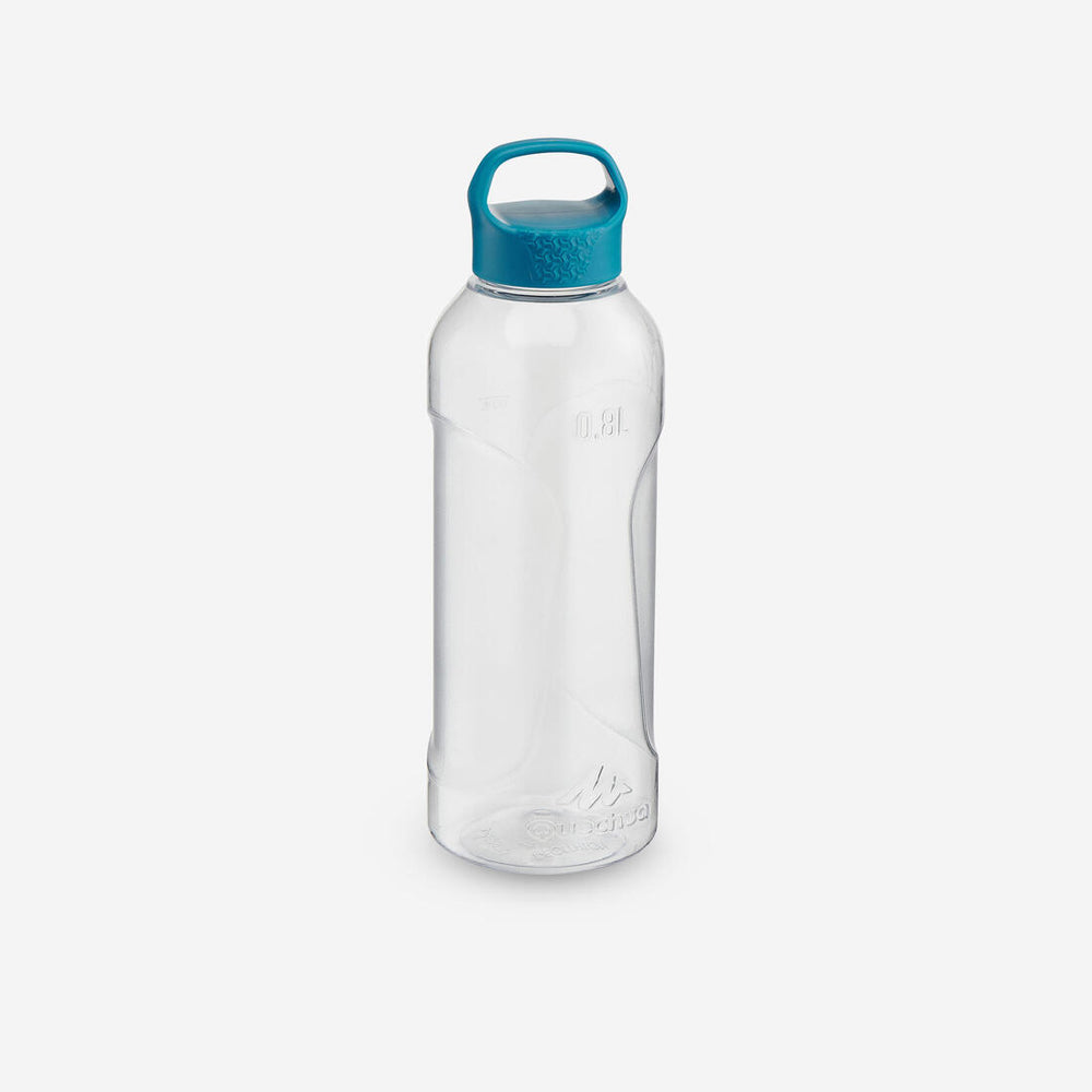For dependable hydration on your hikes, choose our 0.8 L water bottle. Designed with a screw cap, this simple, lightweight, and robust plastic flask ensures quick access with a single-turn top.
