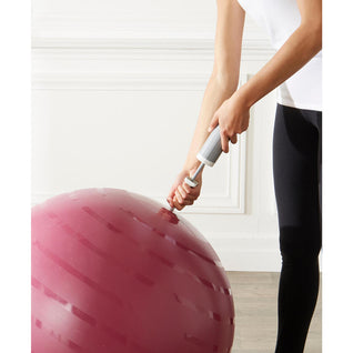 To inflate your ball correctly, you\'ll need: - a pump (ref: 8214626 or 8490986) - a tape measure for measuring the ball Your ball is correctly inflated if: - it is no bigger than its maximum diameter (65 cm for size 2) - your knees are at hip height when you sit on the ball.