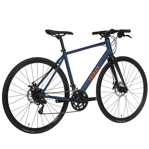 Ergonomic aluminium Triban flat handlebars for a better grip and excellent comfort. Grip with integrated fixing ring Handlebar width (axle-to-axle): XS / S / M : 560 mm. L / XL : 600 mm. Triban forged stem: XS : 70 mm S: 80 mm M: 90 mm L: 100 mm XL: 110 mm