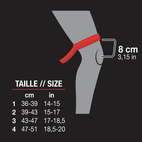 Measure around your leg, 8 cm above your kneecap. Then match the measurement taken with the following size chart: Size 1: 36 - 39 cm Size 2: 39 - 43 cm Size 3: 43 - 47 cm Size 4: 47 - 51 cm