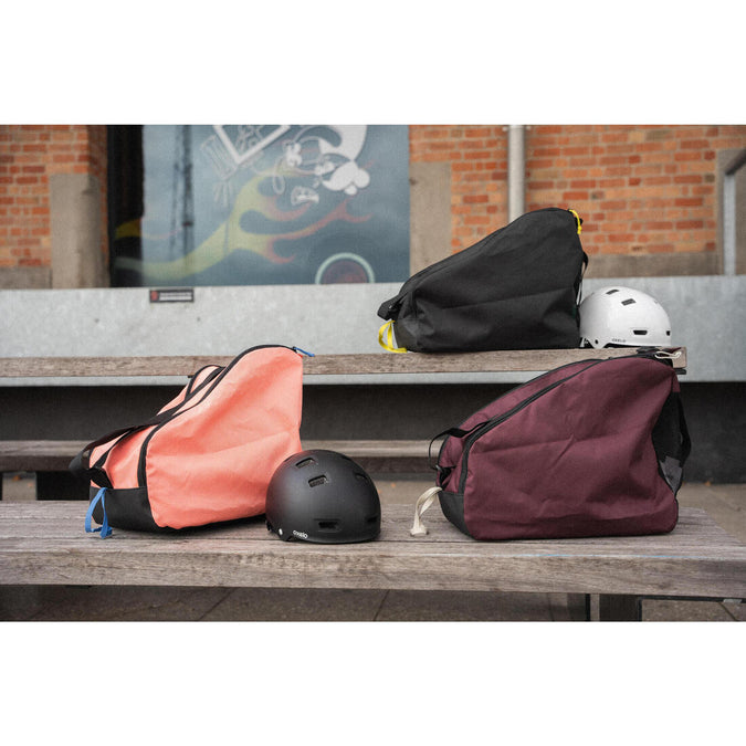 Perfect for storing inline skates up to size 8 and protective gear. Rounded triangular shape. Dimensions: Length: 40 cm, width: 20 cm, height: 35 cm at the highest point.