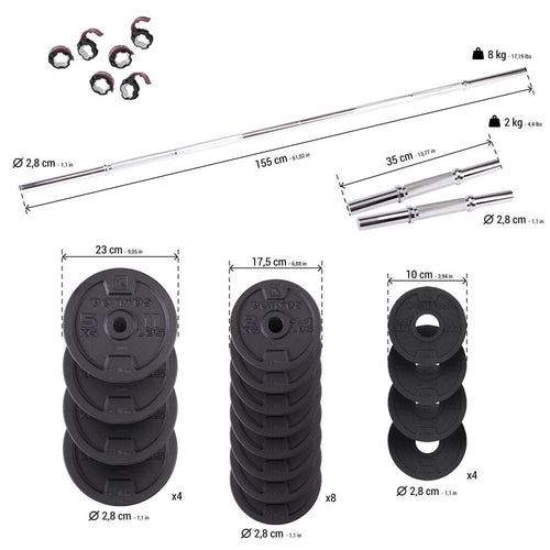 - 2 x 2 kg solid bars (35 cm long, 28 mm diameter) - 1 x 7.8 kg bar (155 cm long, 160 kg max load) - 4 x 5 kg cast iron discs - 8 x 2 kg cast iron discs - 4 x 0.5 kg cast iron discs The set comes with 3 pairs of disc collars