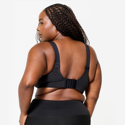 Every part of this sports bra was designed for maximum comfort. Its reinforced full-coverage cups provide perfect bust support. The padded straps and wide elastic band under the bust improve its comfort. Finally, the three-position back hooks allow you to adjust the bust circumference. All of these details make this sports bra particularly well-suited to larger busts up to H cups.